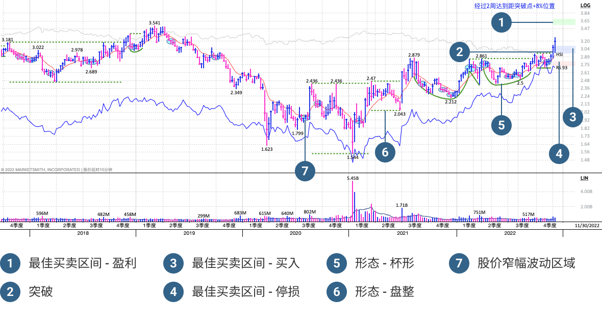 股价窄幅波动区域是指最少三周内的收市价格范围都浮动在1.5%上下,MarketSmith的形态辨识功能将股价窄幅波动区域在周线图上用蓝色椭圆形表示。股价窄幅波动说明做多和做空资金对比在一段时间内不相上下,这意味着下一阶段,尤其是当成交趋向活跃时,股价走势向上的概率会大幅提升。