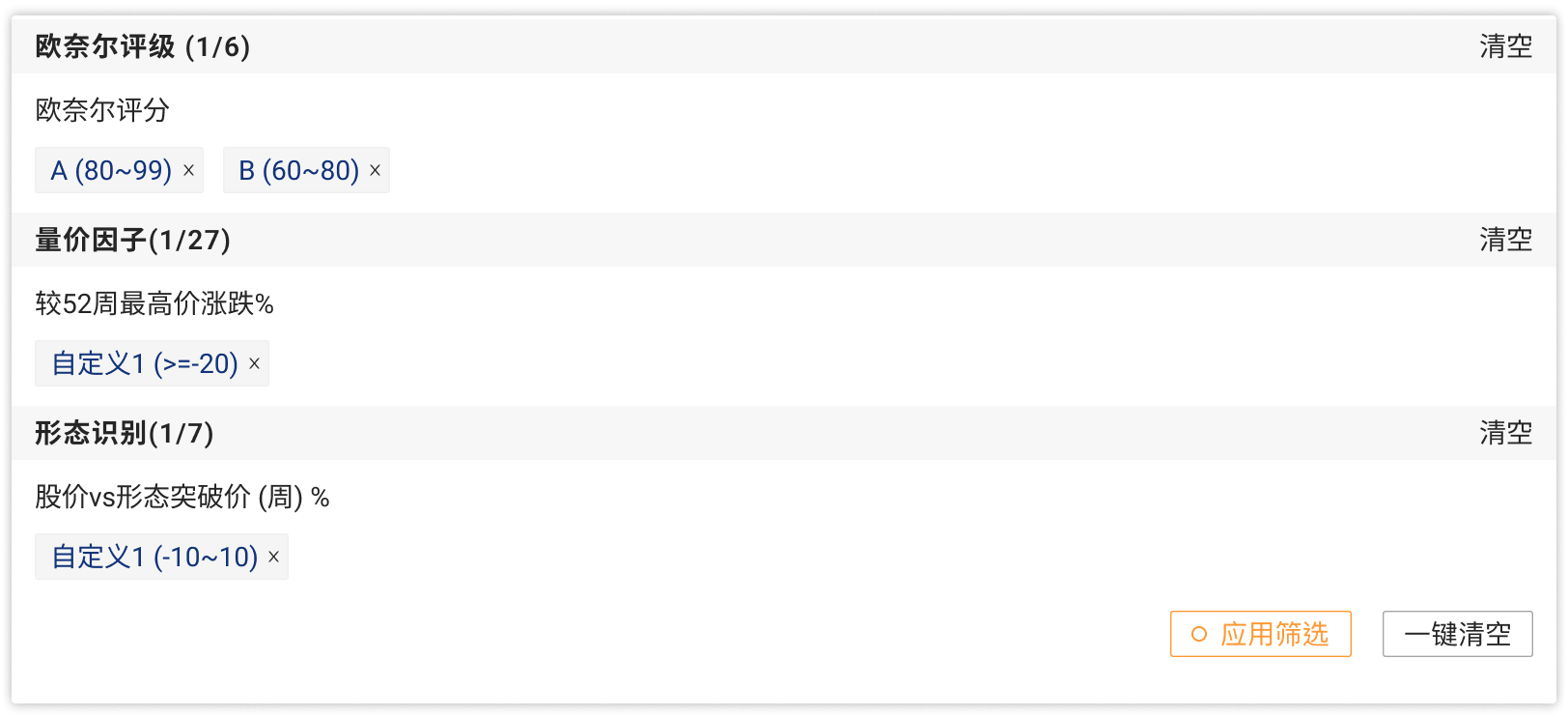 找到最近在MarketSmith软件周线图上处于形成中或形态构建已完成的股票,且当前股价在突破价格上方或下方不远处,可以通过设定以下筛选条件来达成: